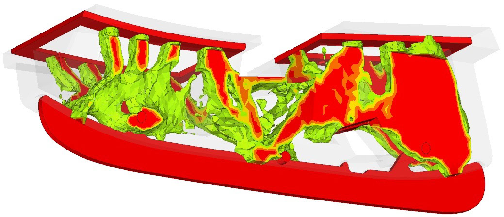 - L’optimisation a permis d’orienter le design vers des zones plus denses, comme indiqué par les couleurs rouges, qui représentent les zones de renfort principal.