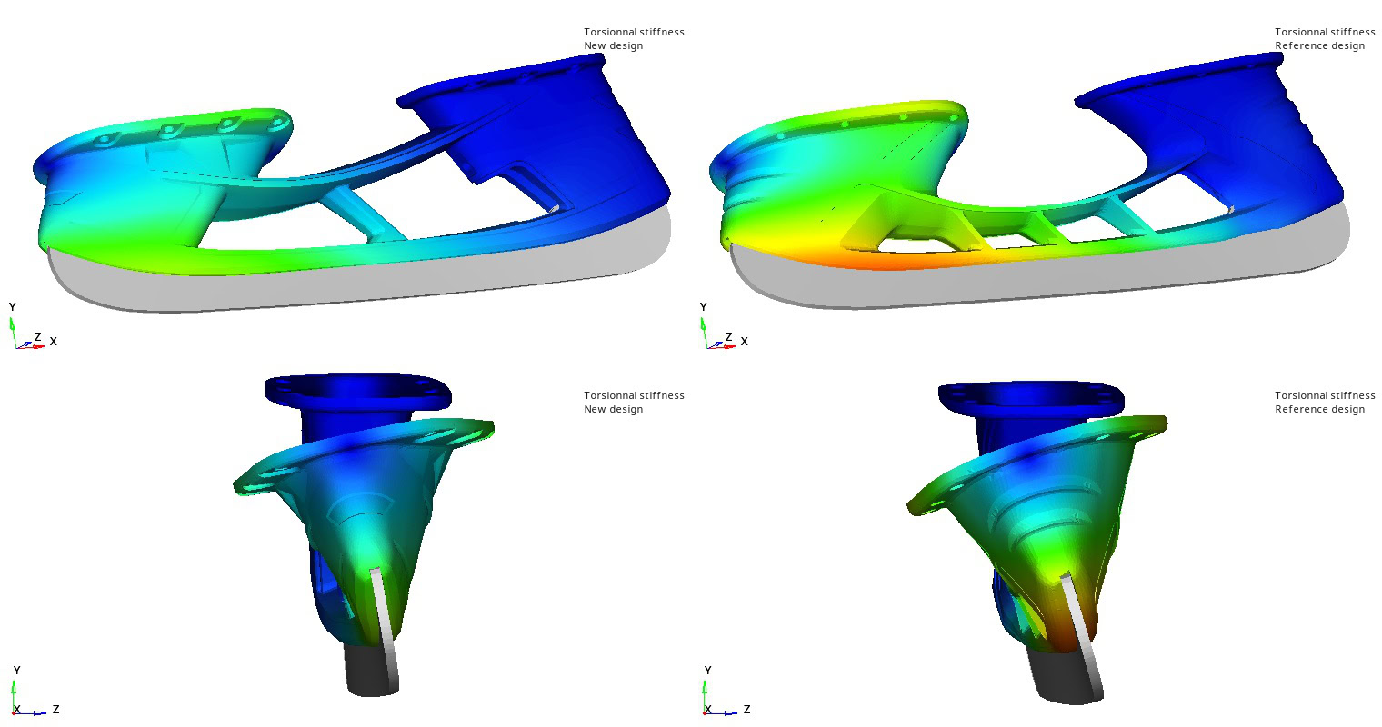 Lx Sim et Bauer Hockey ont travaillé en étroite collaboration pour développer un porte-lame optimisé, alliant performance, rigidité et fonctionnalité. Ce projet a permis d’atteindre les objectifs de rigidité en flexion, en torsion et en compression, tout en respectant les épaisseurs minimales de matière spécifiées par le client, sans compromettre la performance ni la résistance. Le design final du porte-lame a été mis en production et mis en marché dans le patin Hyperlite 2.0.